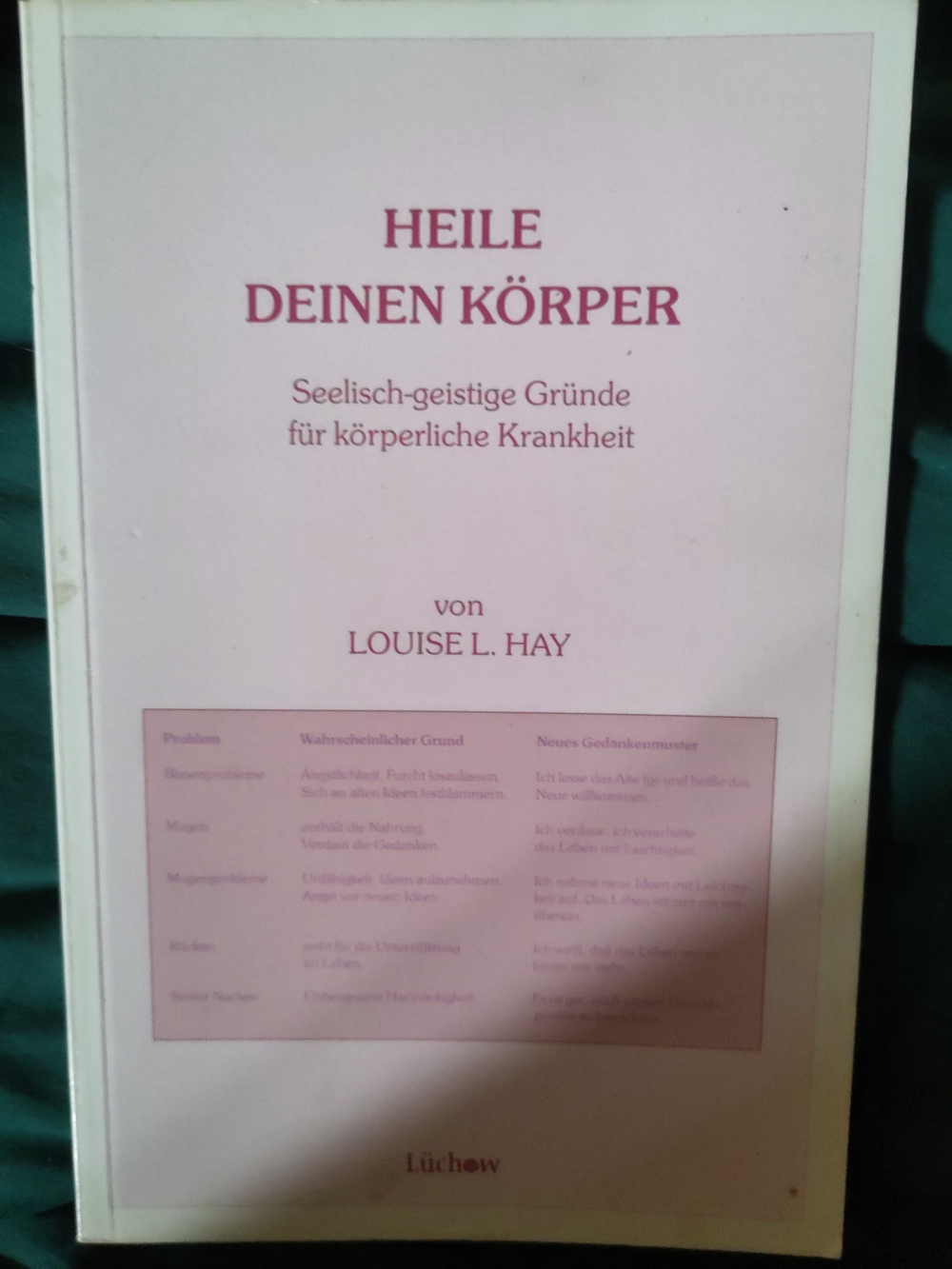 Louise L. Hay gibt dazu Affirmationen (neue Denkmuster), zu dem Th6 : "Ich vertraue, dass das Leben sich auf positive Weise vor mir entfaltet. Es ist gut, mich selbst zu lieben."